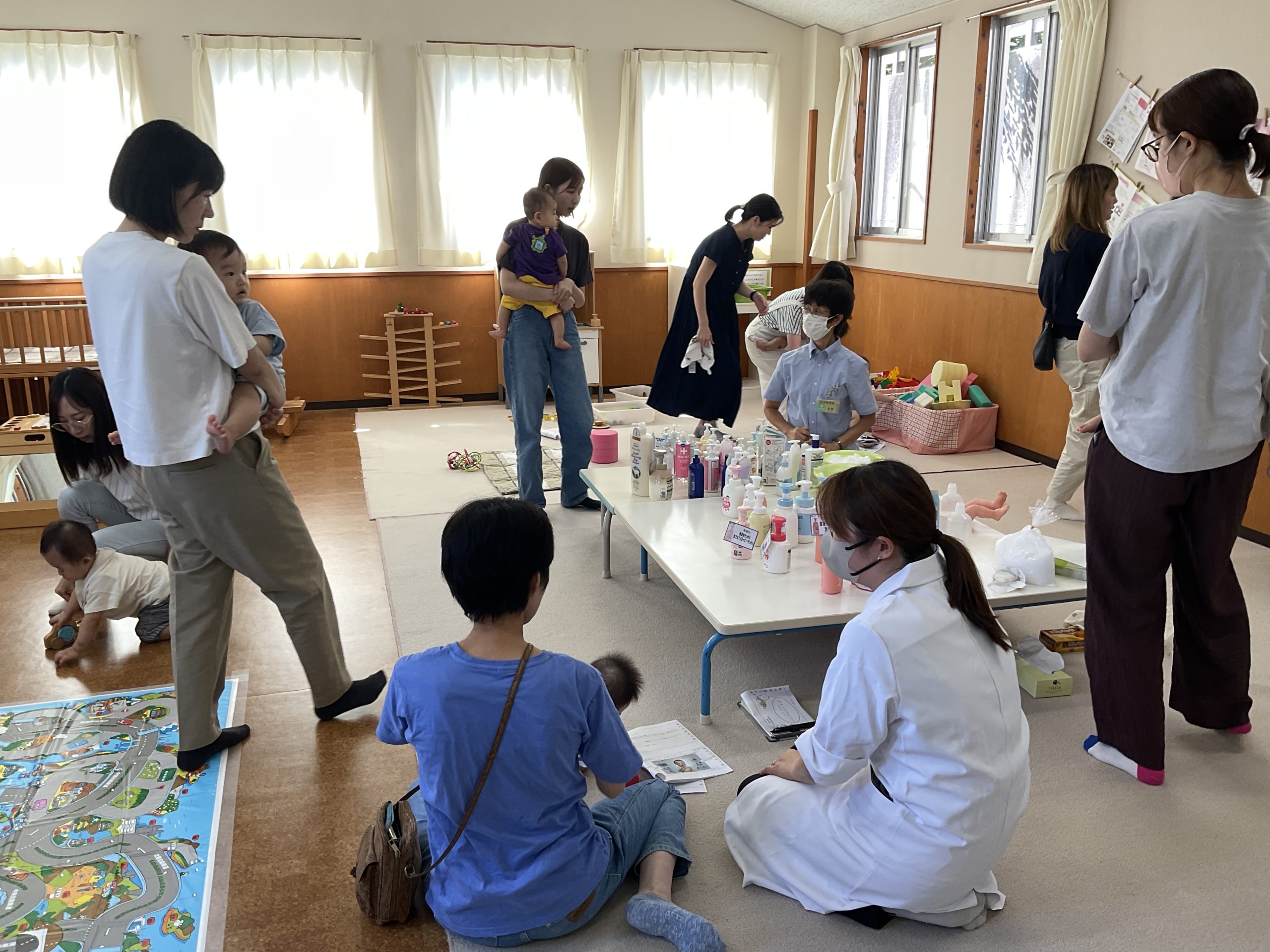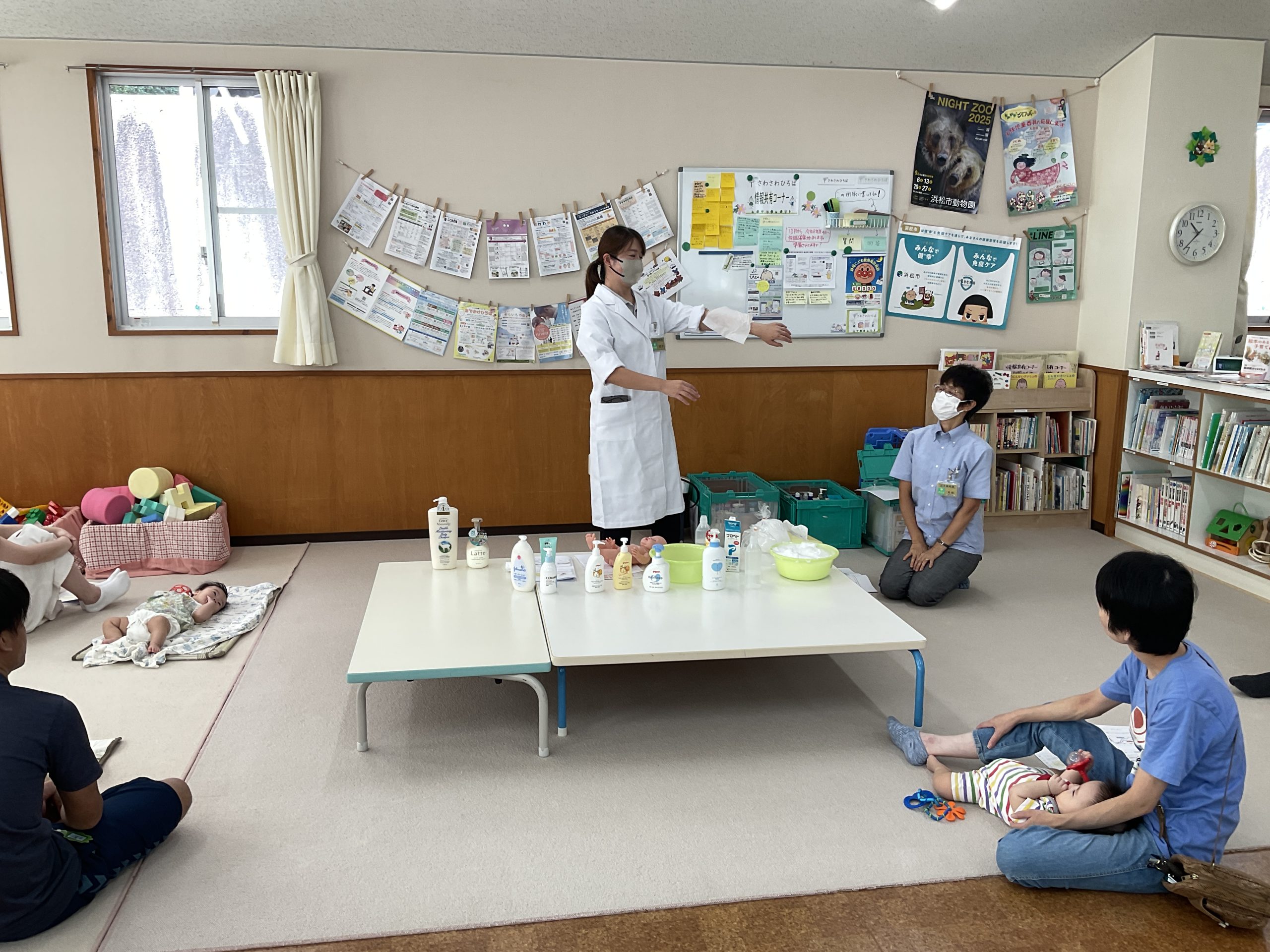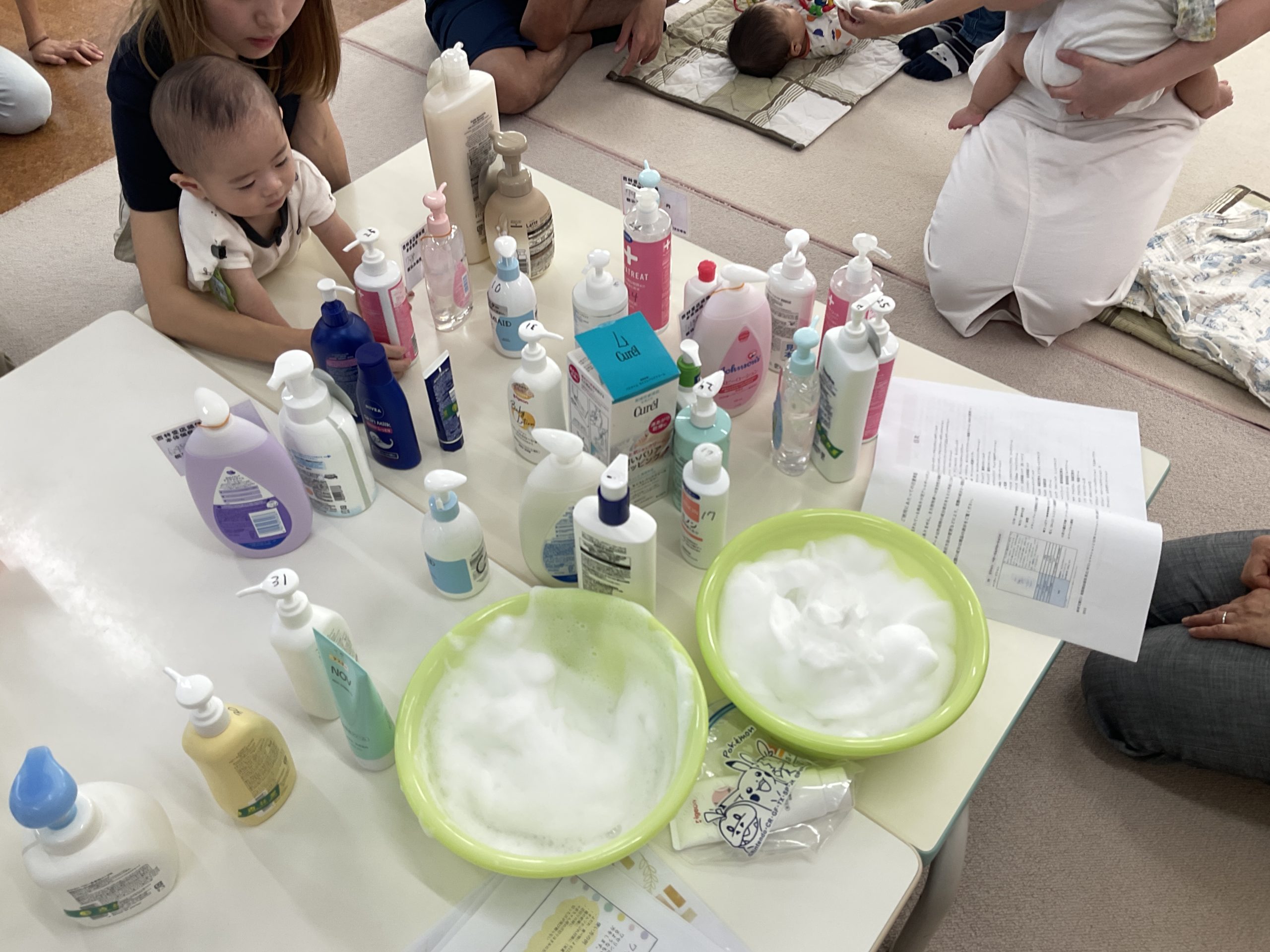 薬剤師さんから 皮膚の役目やアレルギーのお話を聞いたあと、皮膚の洗浄のしかたや保湿剤の使い方について実践して頂きました。