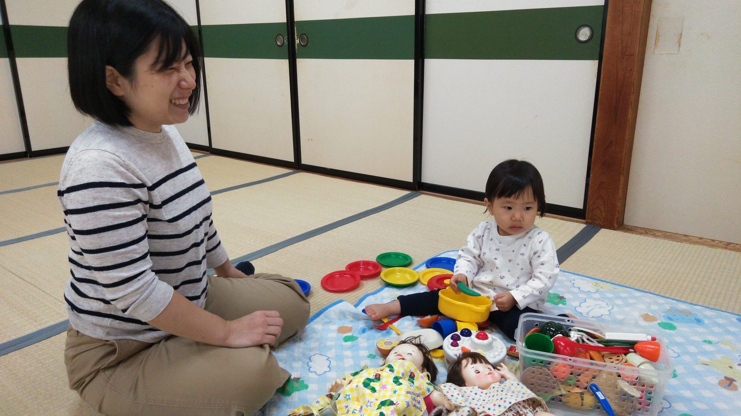 おままごと遊び。お人形さんは何が食べたいんでしょう。食欲の秋ですね。