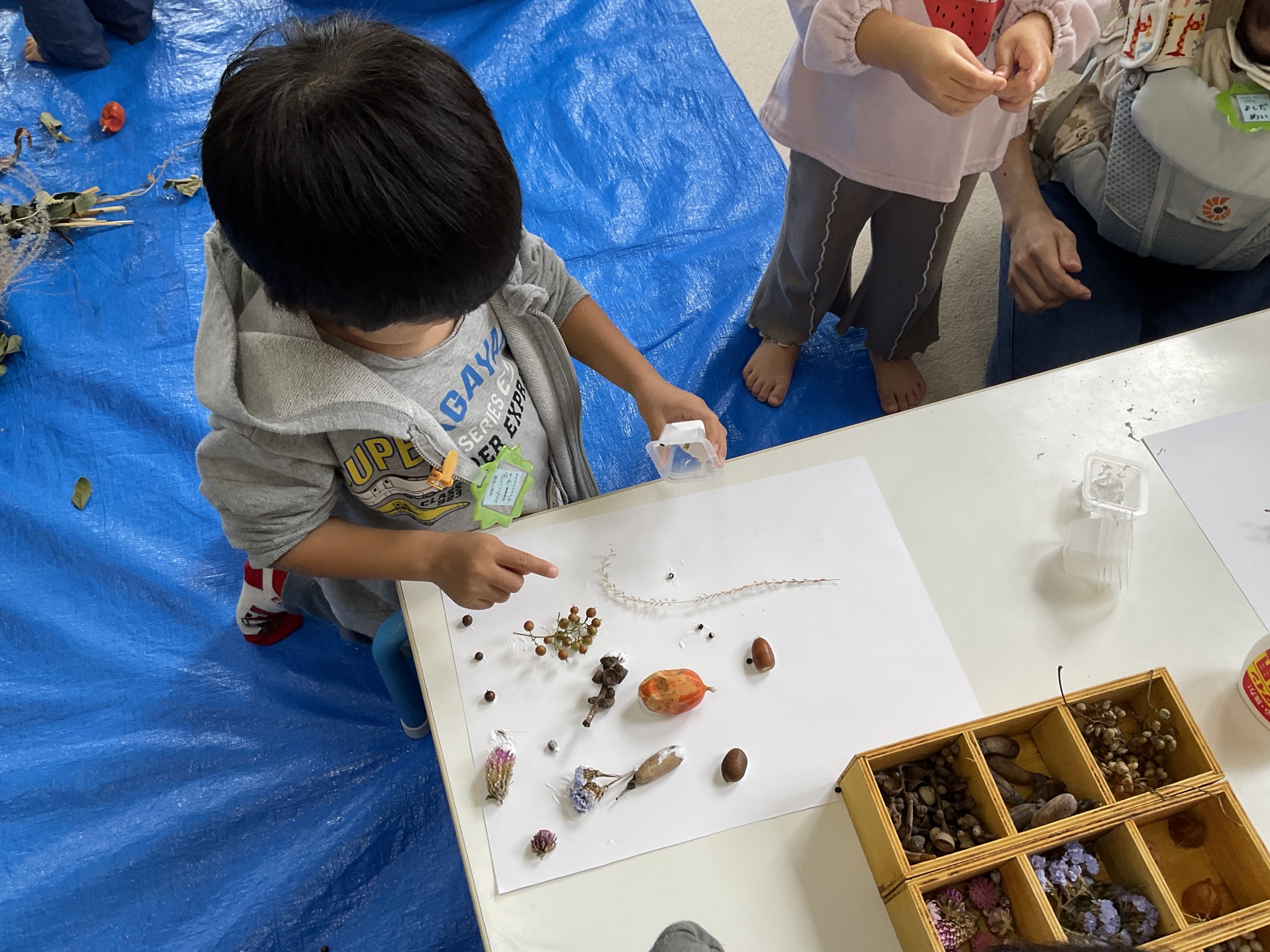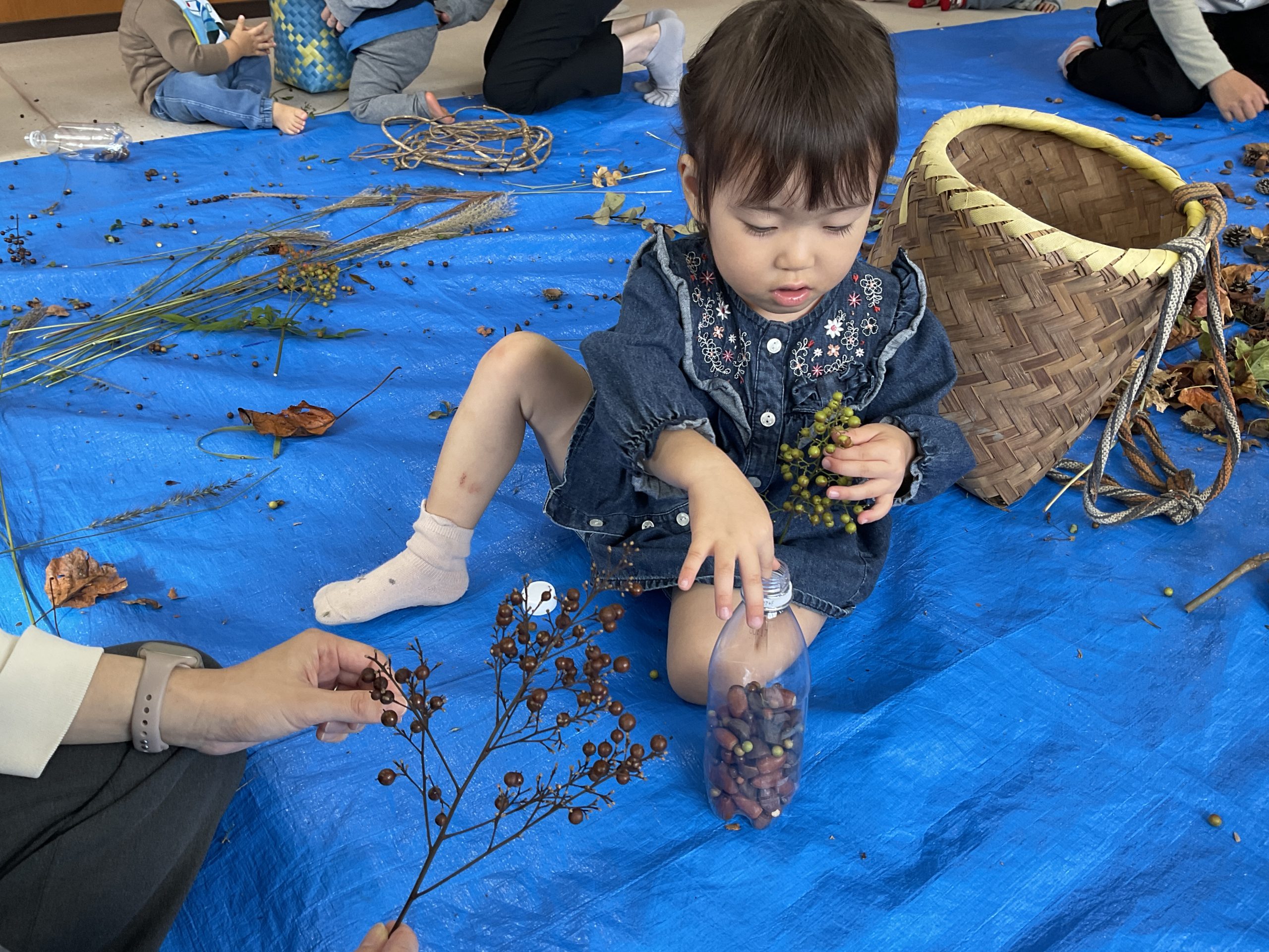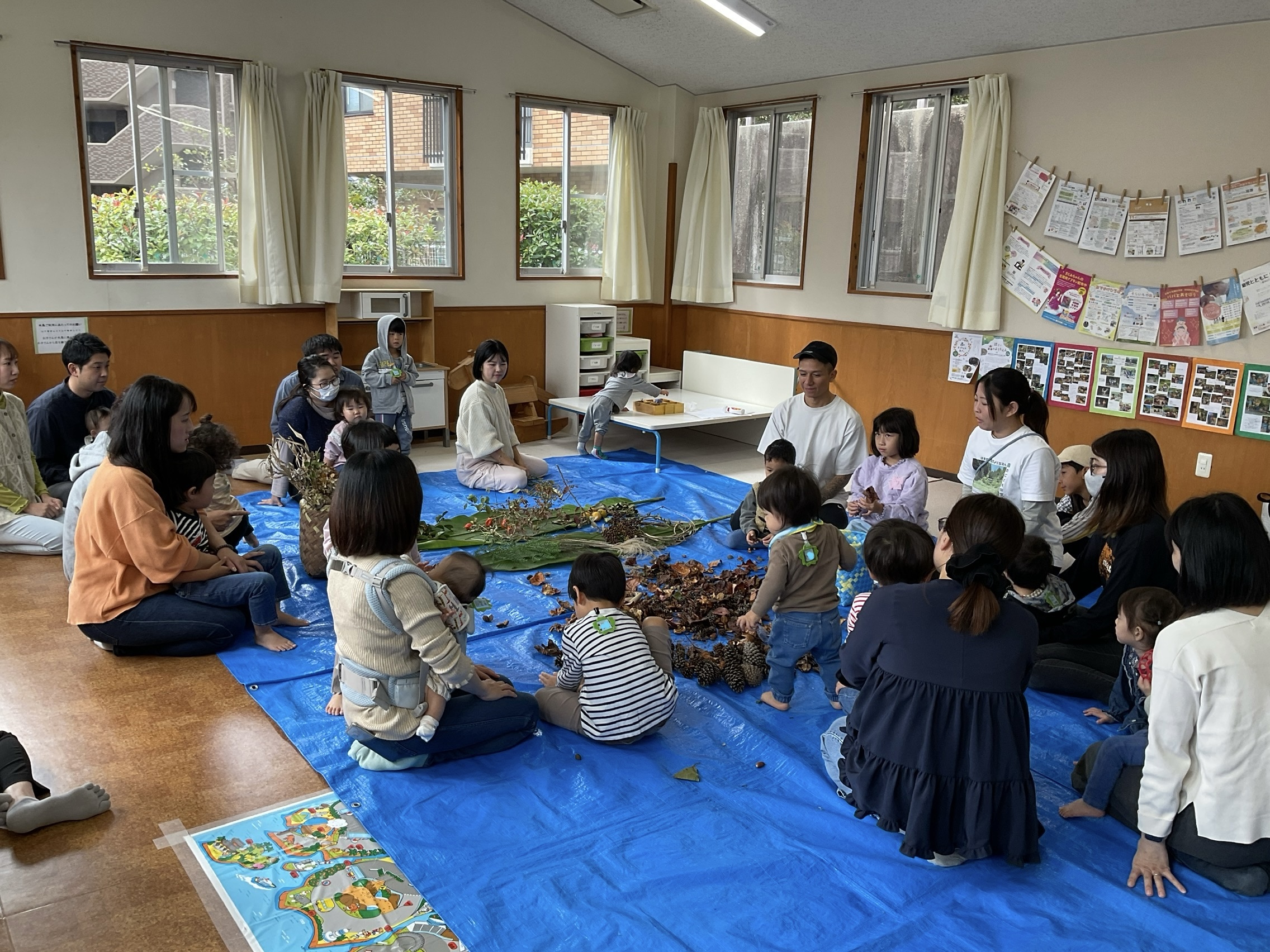 今日は、「森のようちえん」の林さんが、「親子で秋にふれる自然あそび」をテーマに、季節を感じる遊びを用意してくれました。
