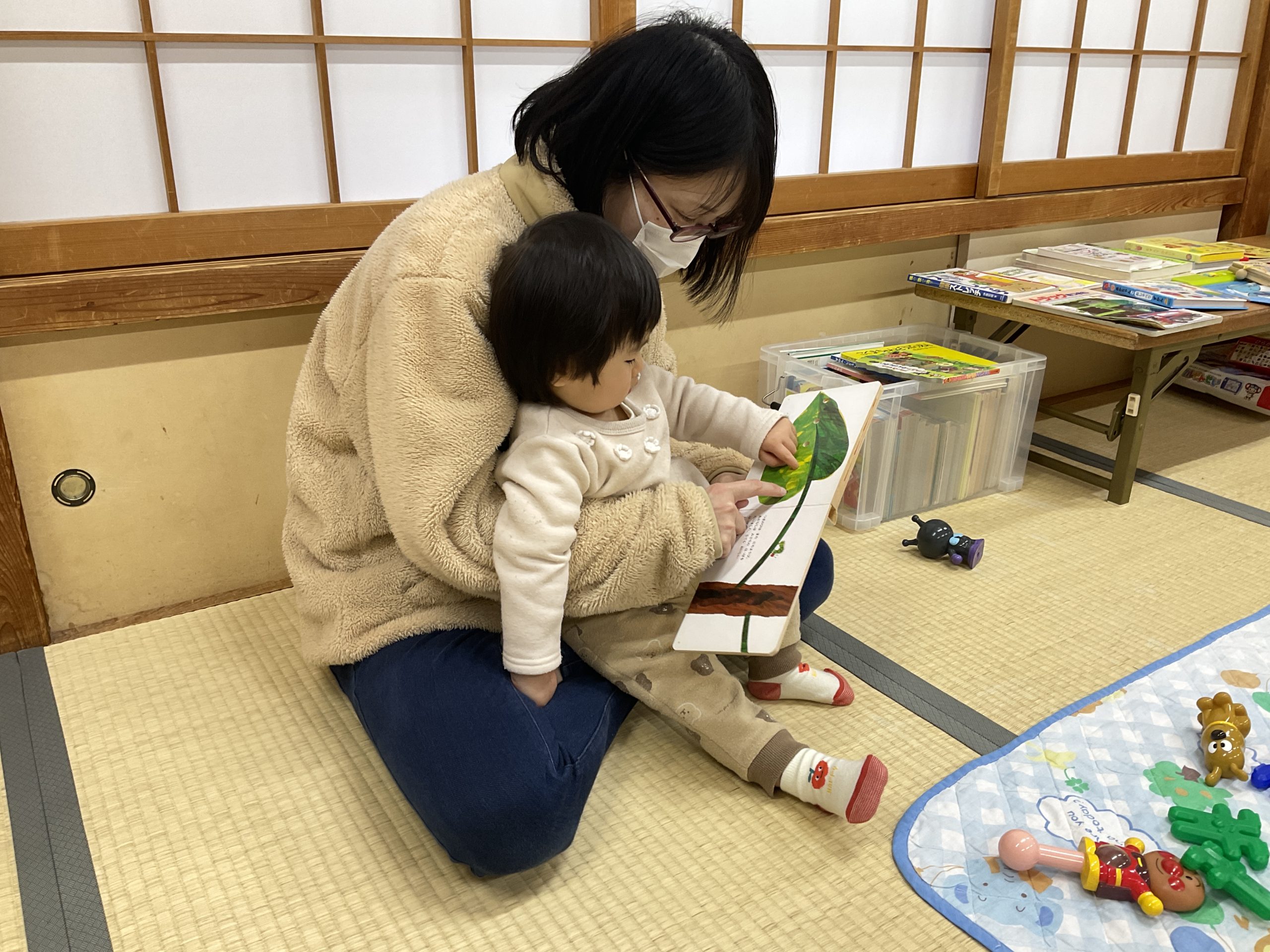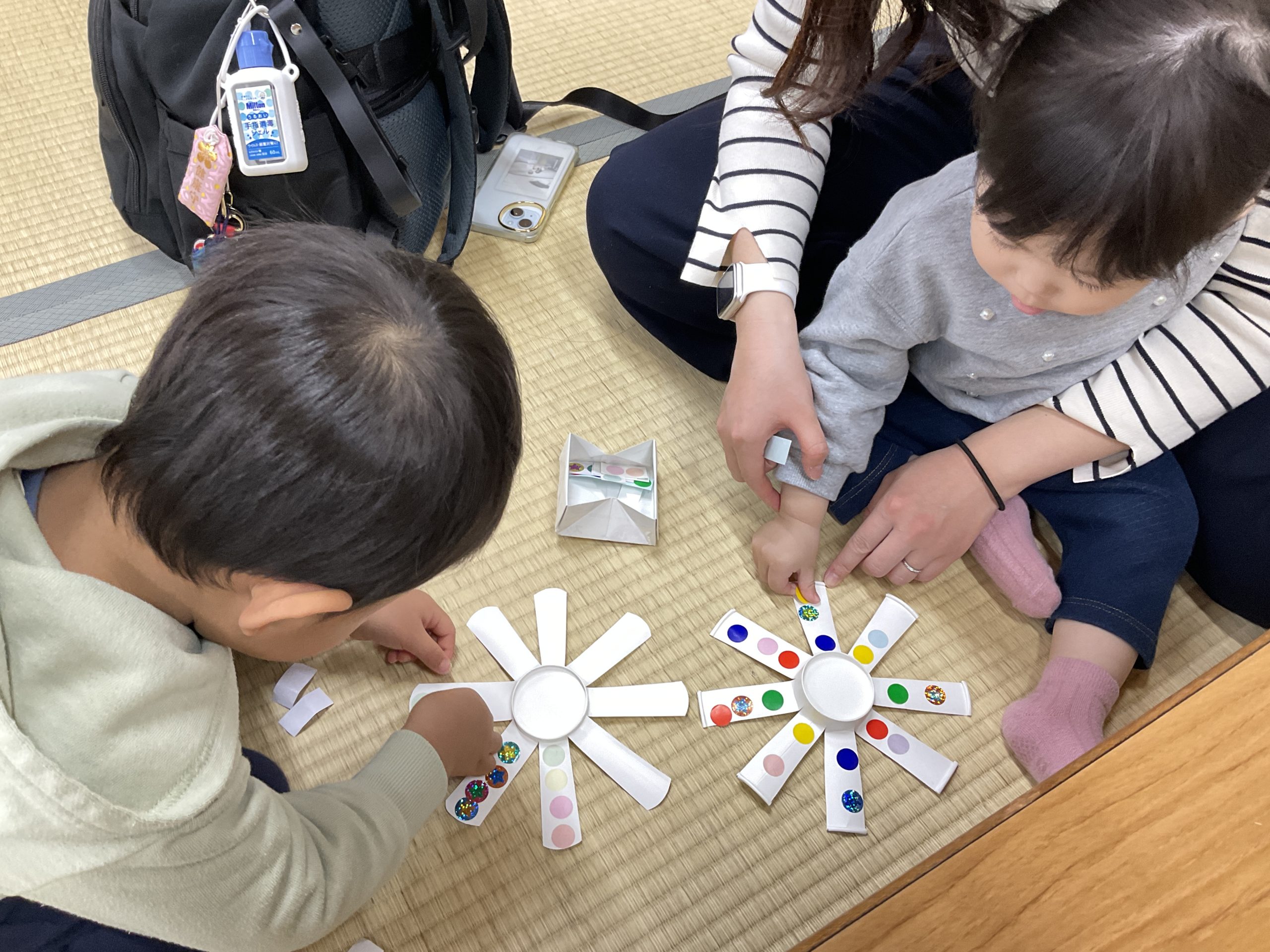 月齢が大きくなるにつれて指先が発達してきているので、剥がす、貼るが楽しくなり、両面に貼って豪華なコマが完成しましたね。