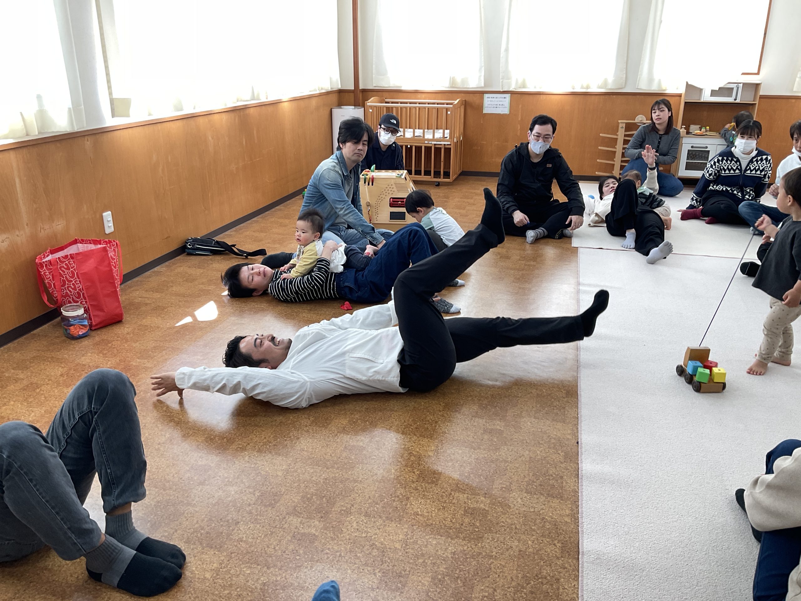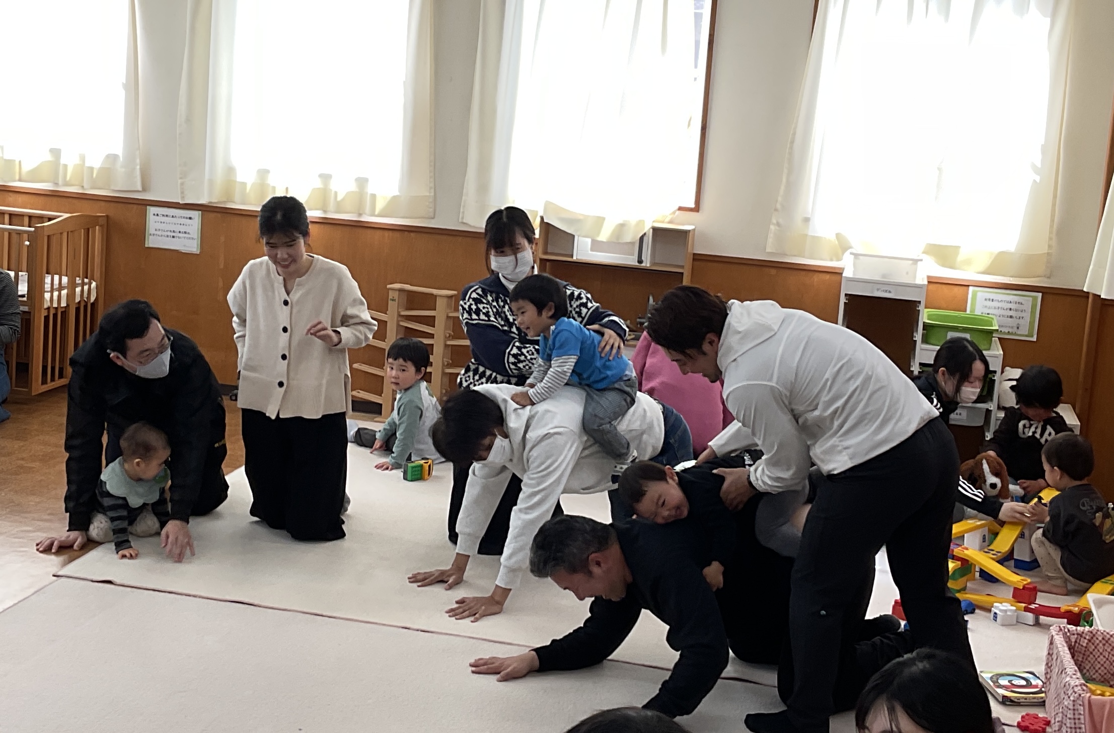 背中やお腹にお子さんをのせて、お家でもできる運動。